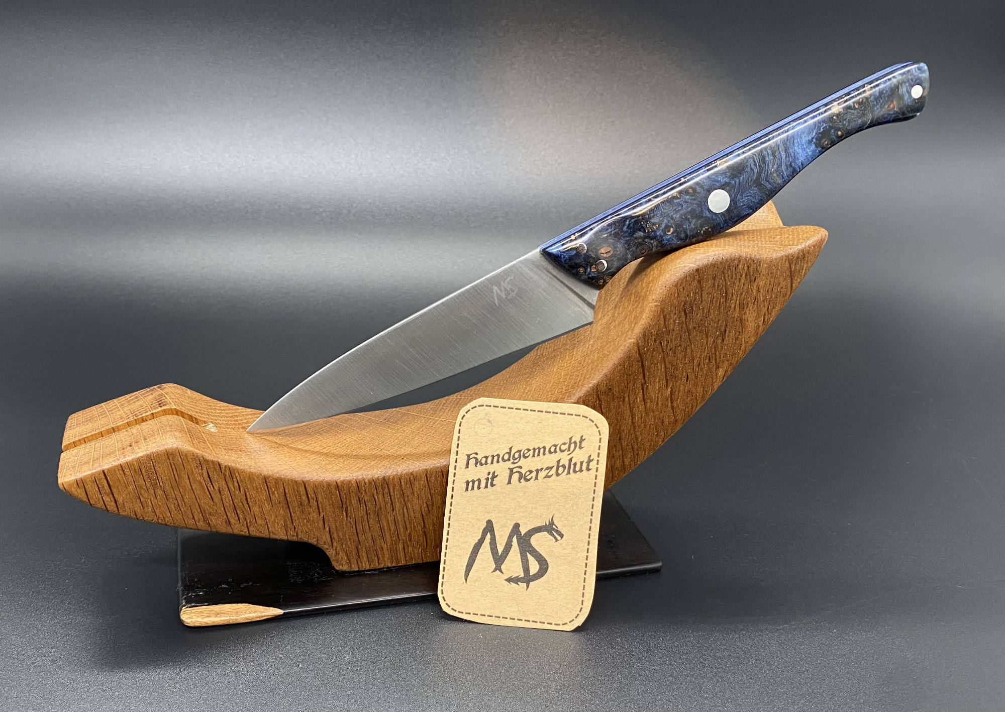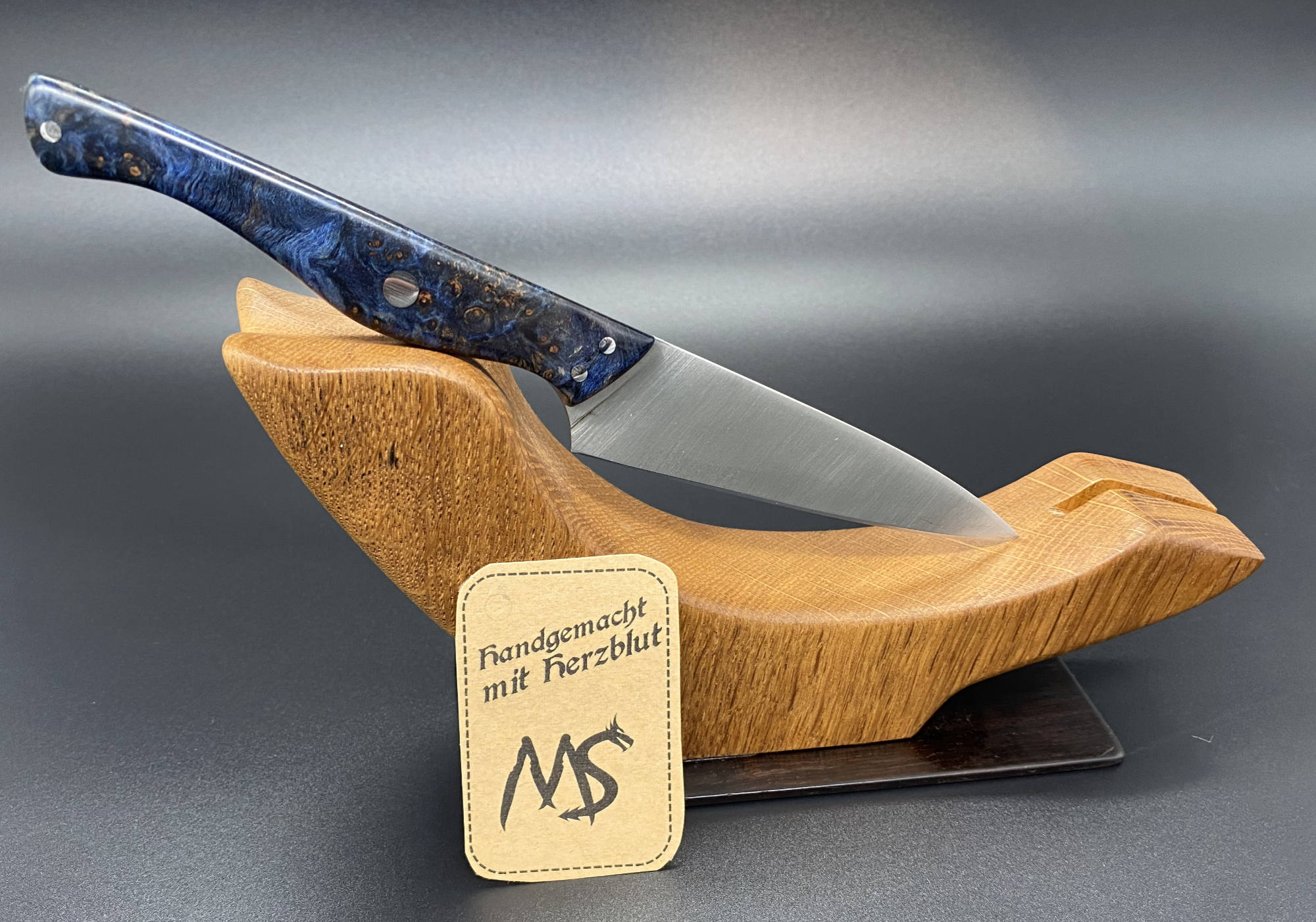 Dieser kleine Küchenhelfer ist sehr handlich. Als Stahlsorte wurde 14c28n verwendet. Blaue G10 Liner runden das stabilisierte Griffholz bestens ab.