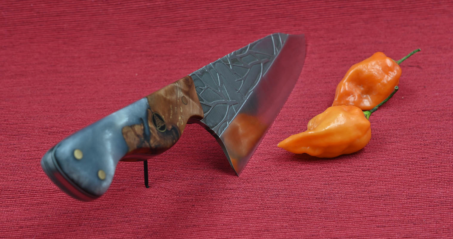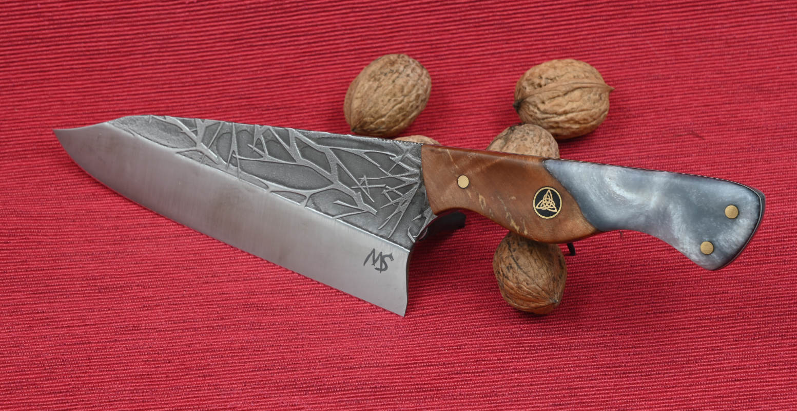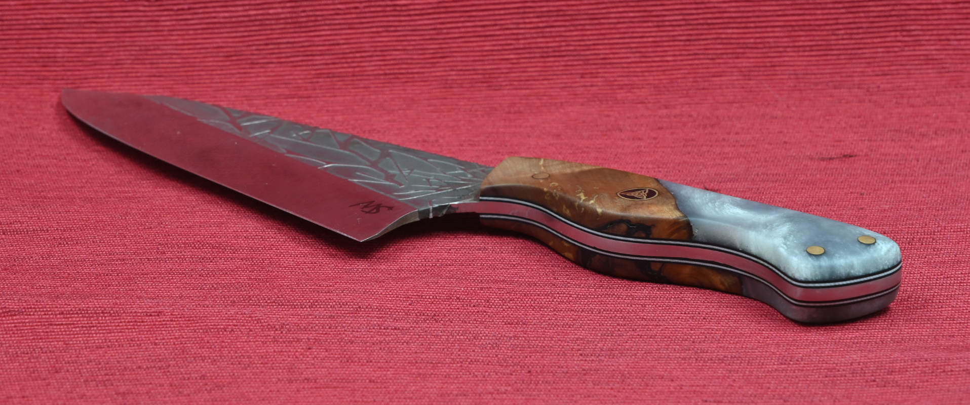 Käsemesser/Küchenmesser mit aufwendigem 3D-Struktur.Die Klinge besteht aus rostträgem 3mm starkem Messerstahl „Niolox“ gehärtet auf 61hrc.Gesamtlänge beträgt 26cm.15cm sind auf 17° rasiermesserscharf geschliffen.