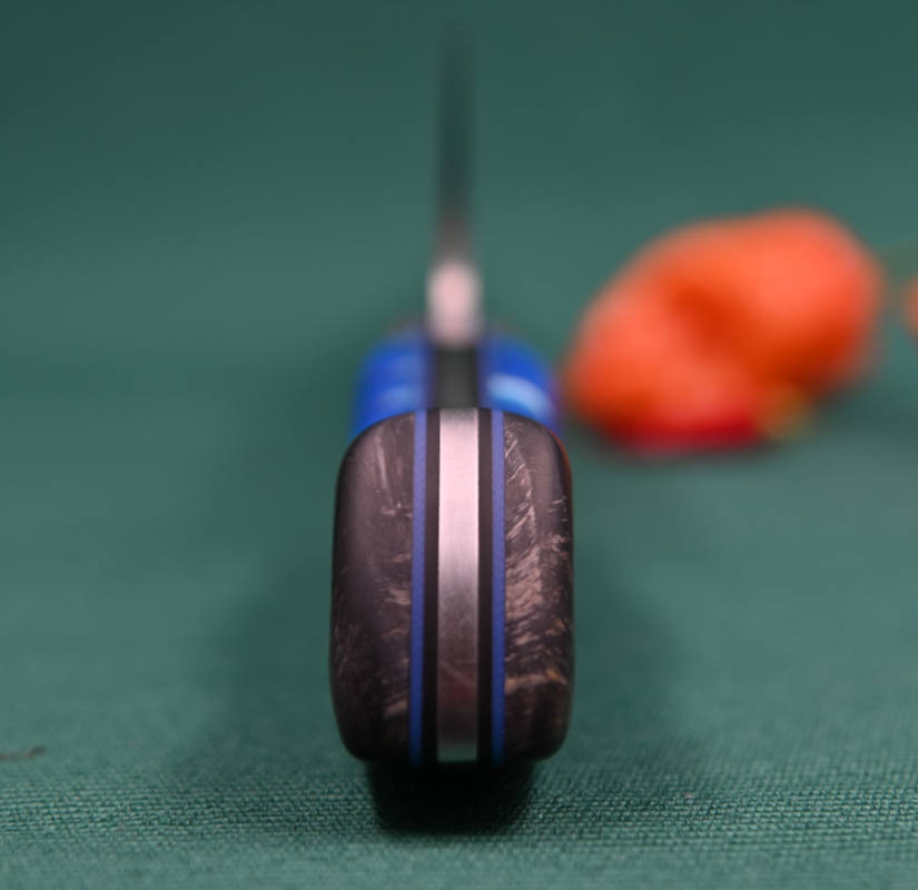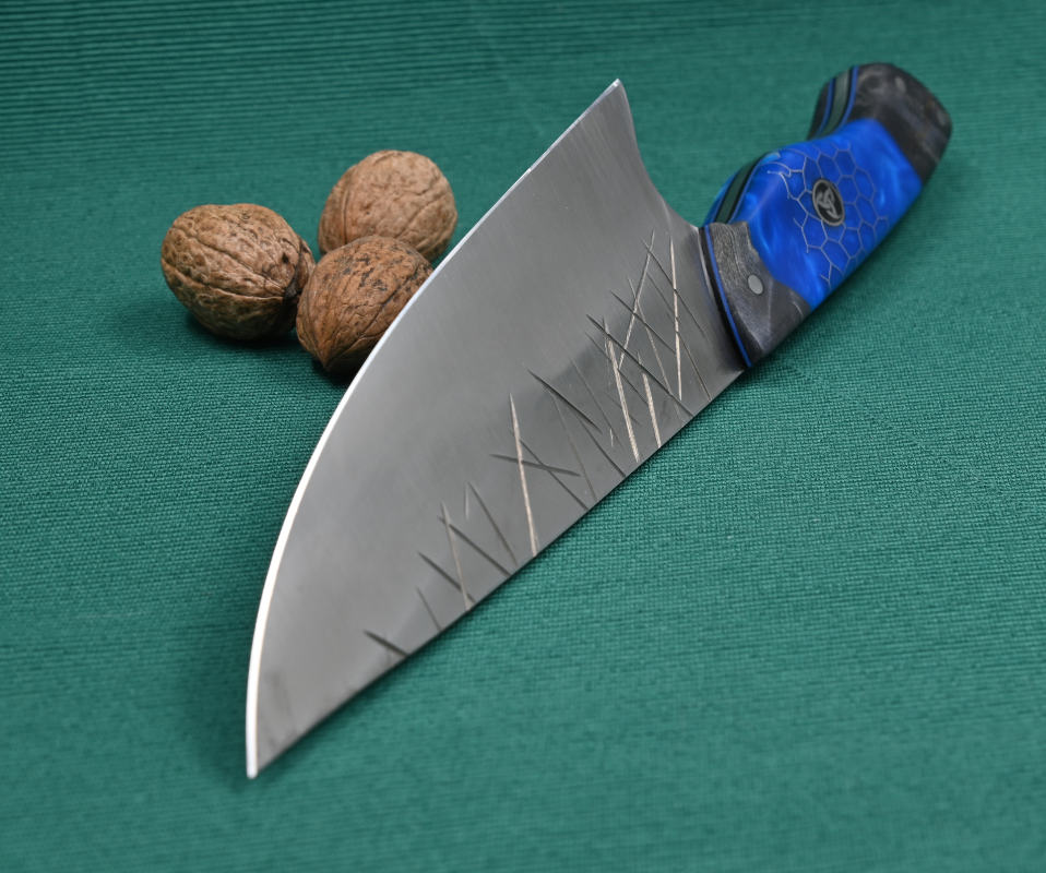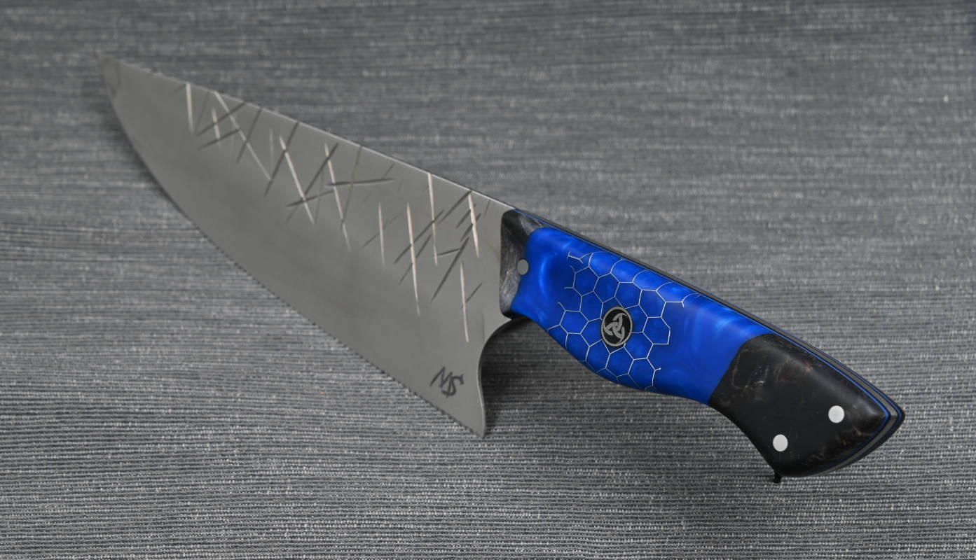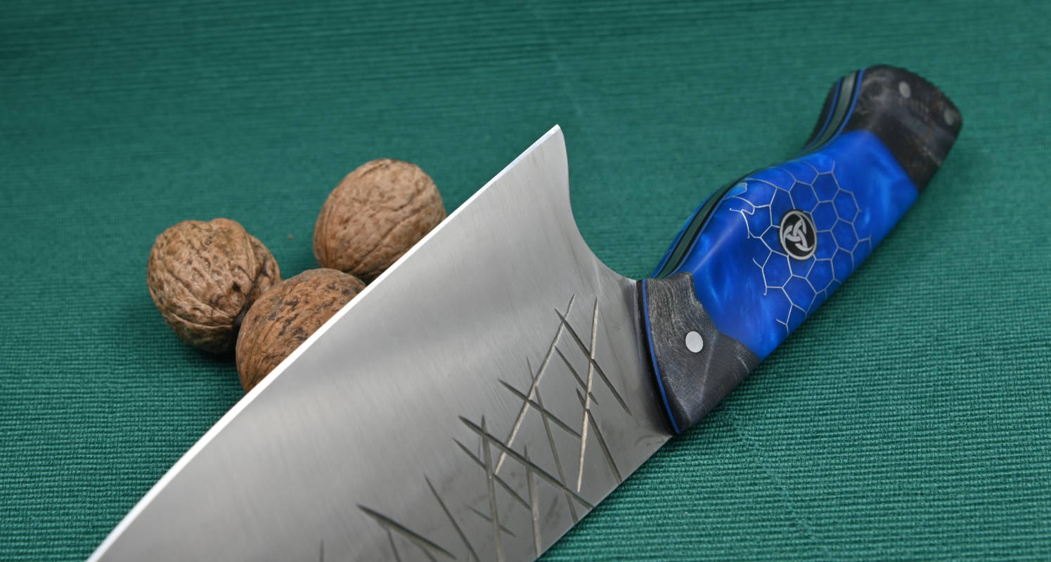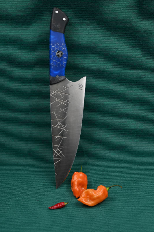 ChefmesserStahlsorte: 3mm NioloxHärte: 61hrcGesamtlänge: 300mmKlinge: 180x60 mmGriffmaterial: Stabilisierte Kastanie mit eingegossenen Aluminiumwaben.Pins: Edelstahl/Triskelesymbol