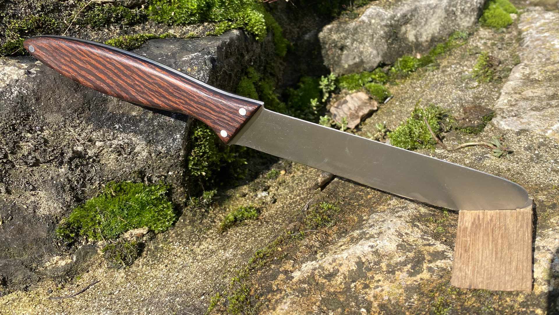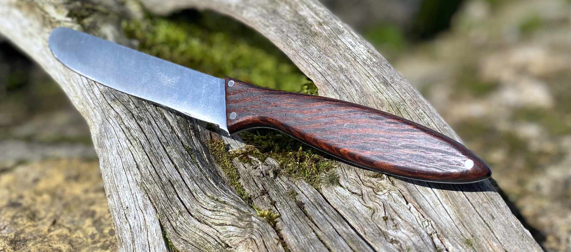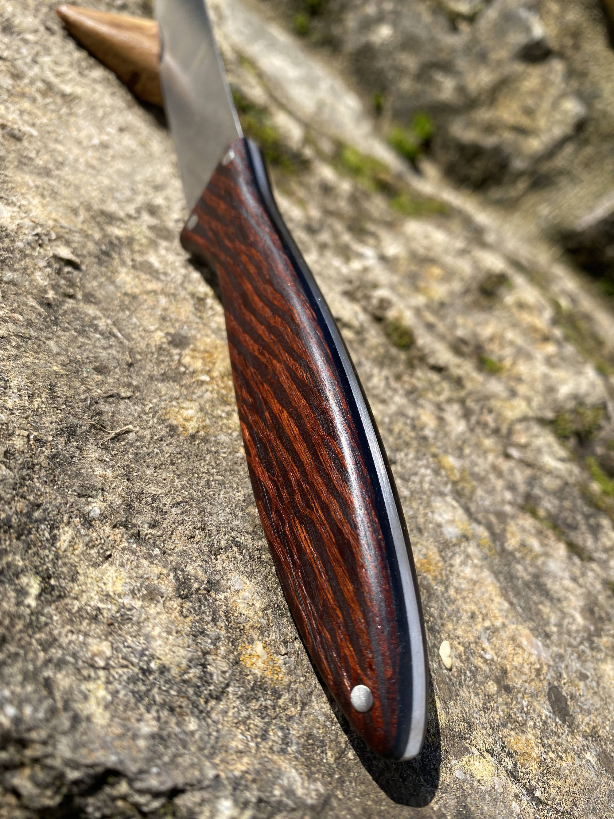 Einfaches Frühstücksmesser, das sehr dünn ausgeschliffen ist. Als Stahlsorte wurde rostfreier 14c28n verwendet. Die Griffschalen bestehen aus wunderschönem Zebrano ein sehr hartes Holz aus Nordafrika, das auch gern im Gittarrenbau verwendet wird.