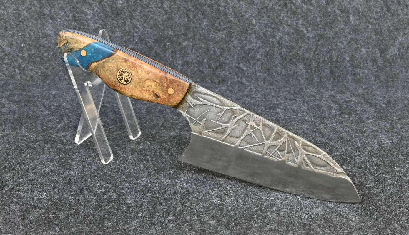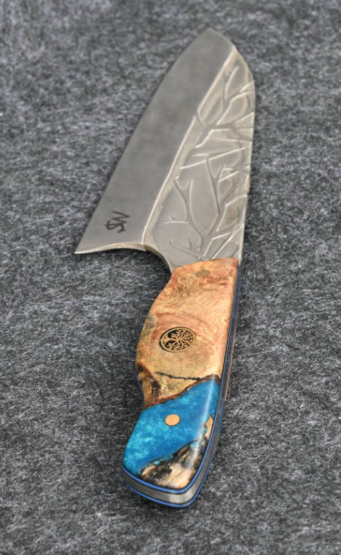 Ein Hybrid aus heimischem Wurzelholz und Epoxy und dem Lebensbaum als Schmuckpin, bildet den Griff. Besonders geeignet für kleinere Hände.
