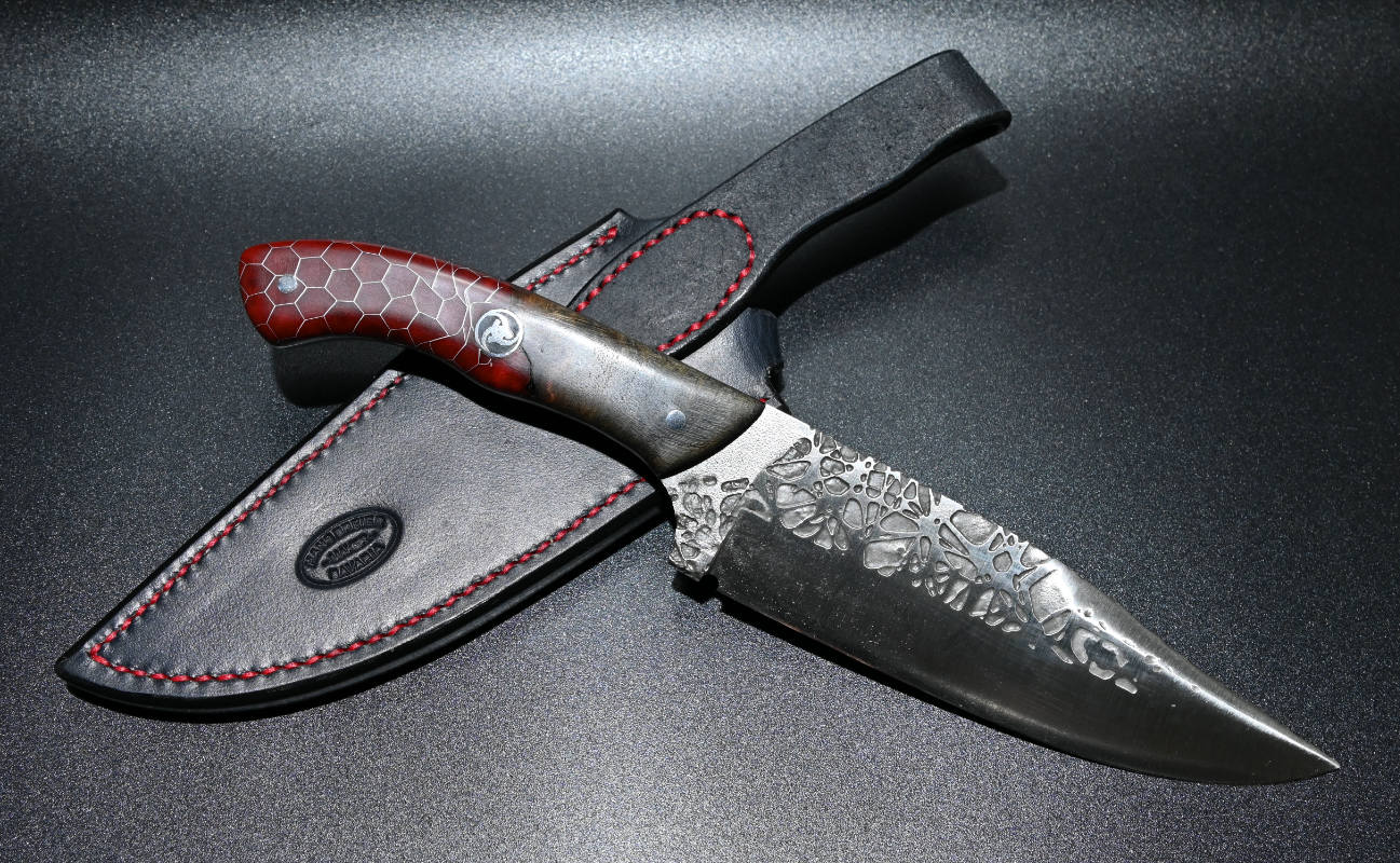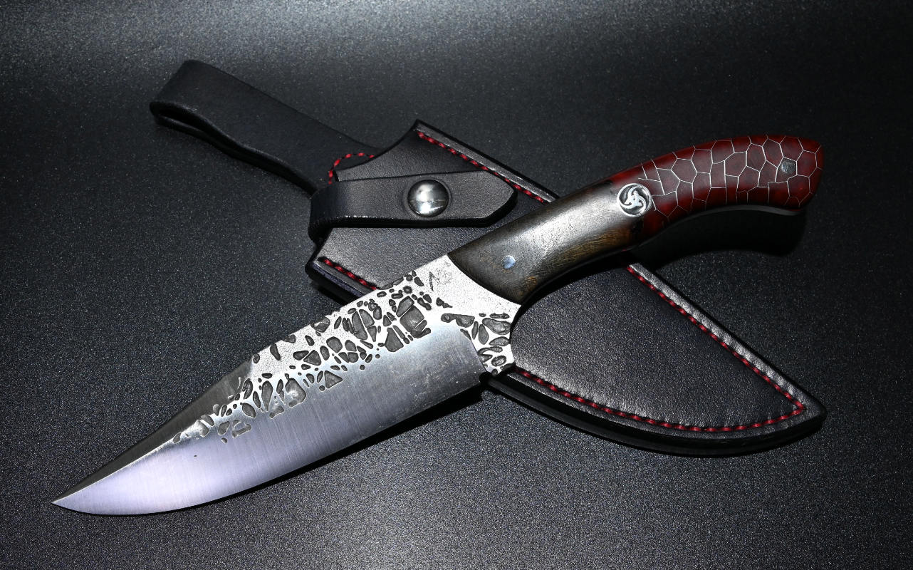 Dieses Jagdmesser ist aus N690 gefertigt. Ein Rostfreier Stahl aus dem Hause Böhler. Als Griffmaterial habe ich ein Stück Maserknolle von der deutschen Eiche stabilisiert und zusammen mit Aluminiumwaben vergossen. Die edle Lederscheide wurde von Hans Braier gefertigt