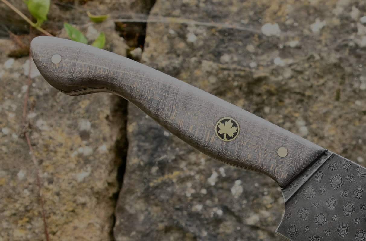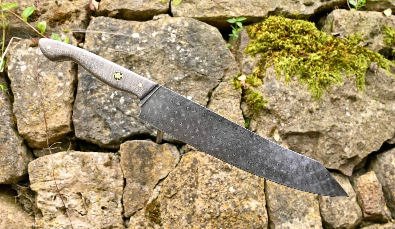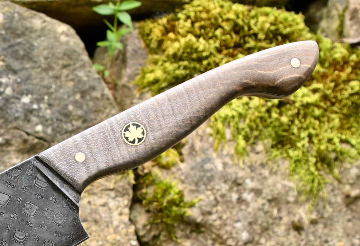 Aufwendig gefertigtes Küchenmesser aus Damast mit Rautenmuster. Im Griff wurde ein besonderesund sehr seltenes Stück stabilisierter, geriegelter Bergahorn aus dem Taubertal verarbeitet.