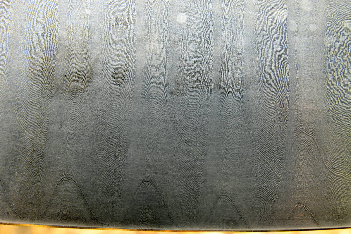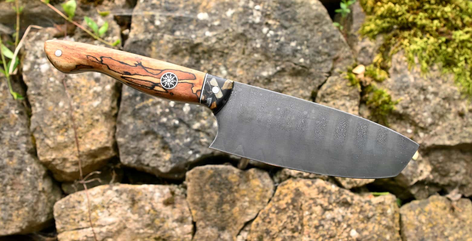 Alles andere als Standart ist dieses kleine elegante Nakiri aus 1000Lagen Damast. Den Griff aus stabilisierter gestockter Buche werten kleine Stücke Backenzahn vom Mammut auf.