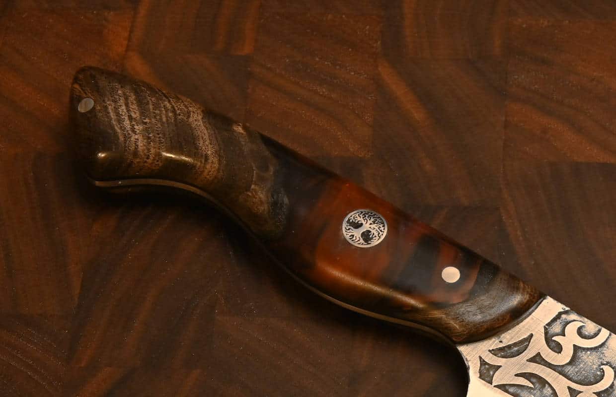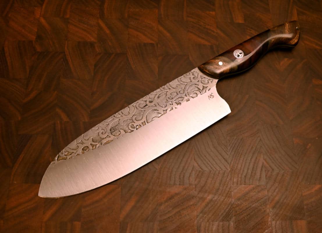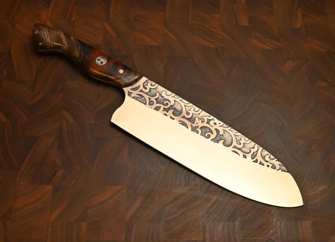 Santoku Ranke Santoku mit aufwendig geätztem Rankenmuster in der Klinge. Details KlingeStahlsorte:1.2510Härte:63 GriffAndalusisches Wurzelmaserholz stabilisiert und eingegossen MaßeGesamtlänge: 320mmKlinge: 190mmStärke: 2mm Jetzt anfragen