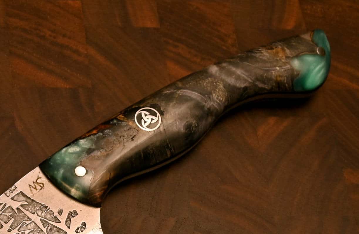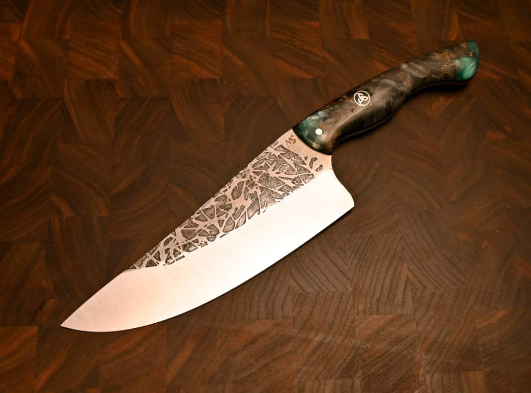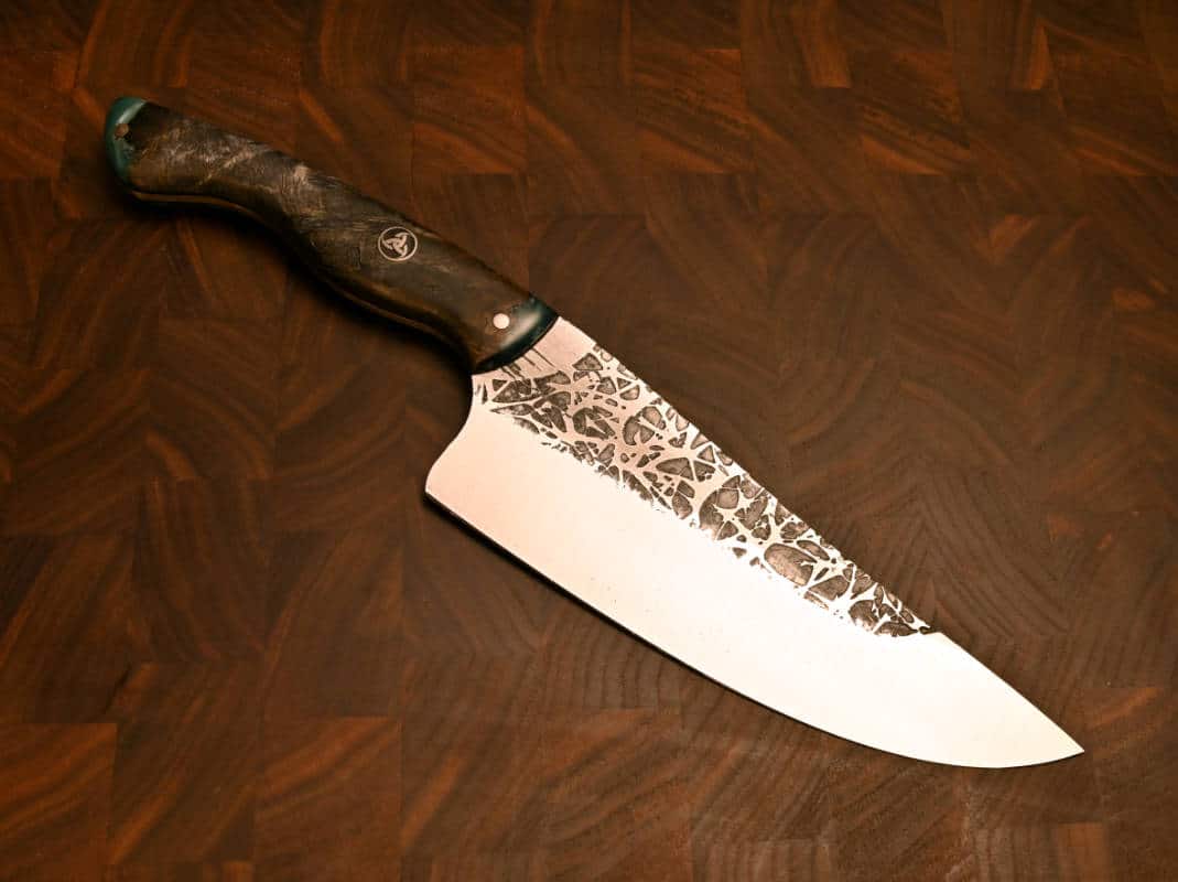 Schwungvolles Chefmesserm mit geätztem Klingenrücken aus Kohlenstoffstahl