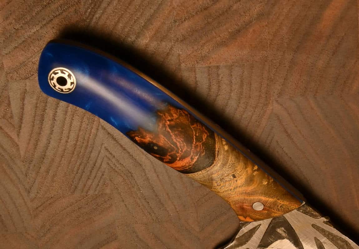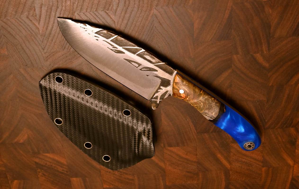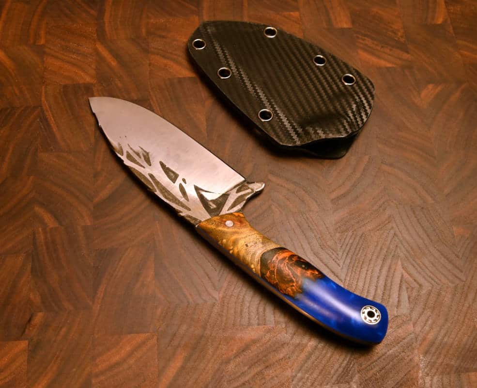 Ein Messer für unterwegs. Ob beim Wandern oder Camping. Ein Idealer Begleiter. Mit Kydexscheide im Carbonlook. Auf wunsch kann natürlich auch eine passende Lederscheide angefertigt werden.
