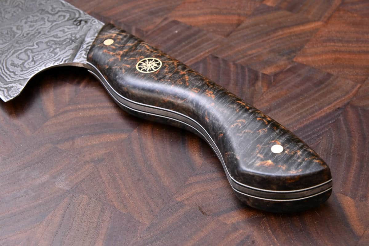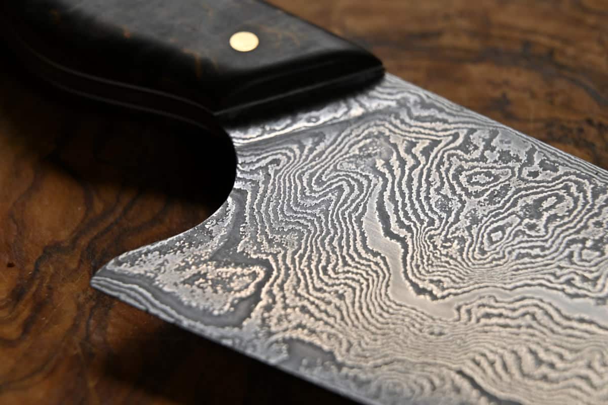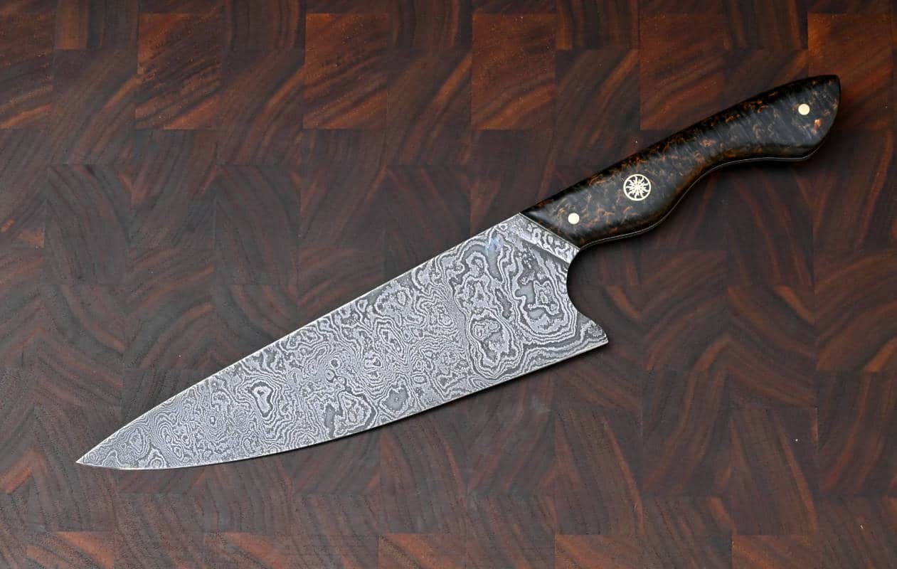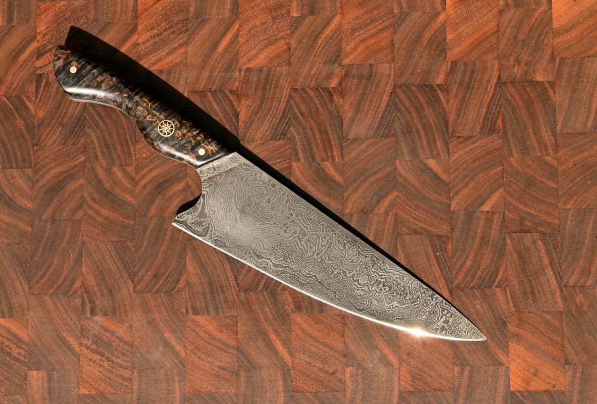 Damast Küchenchef Handgeschmiedetes Chefmesser aus 176 Lagen Damast Details KlingeStahlsorte: 1.2842/75ni8Härte: GriffKarelische Maserbirke schwarz stabilisiert MaßeGesamtlänge: 320mmKlinge: 200mmStärke: 2,5mm Jetzt anfragen