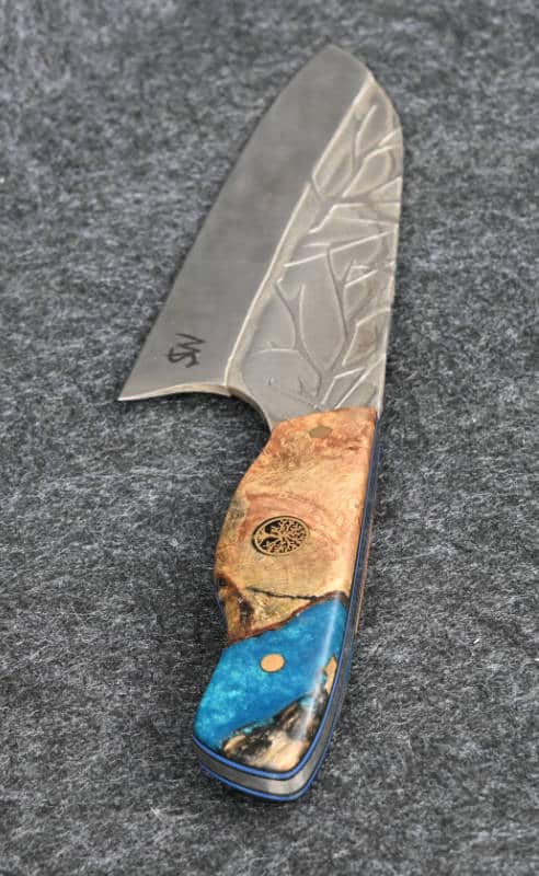 Ein Hybrid aus heimischem Wurzelholz und Epoxy und dem Lebensbaum als Schmuckpin, bildet den Griff. Besonders geeignet für kleinere Hände.