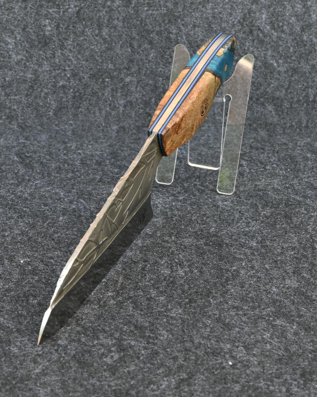 Klinge: Stahl rostfrei Niolox – gehärtet auf 61HRC, mit geätztem Muster.