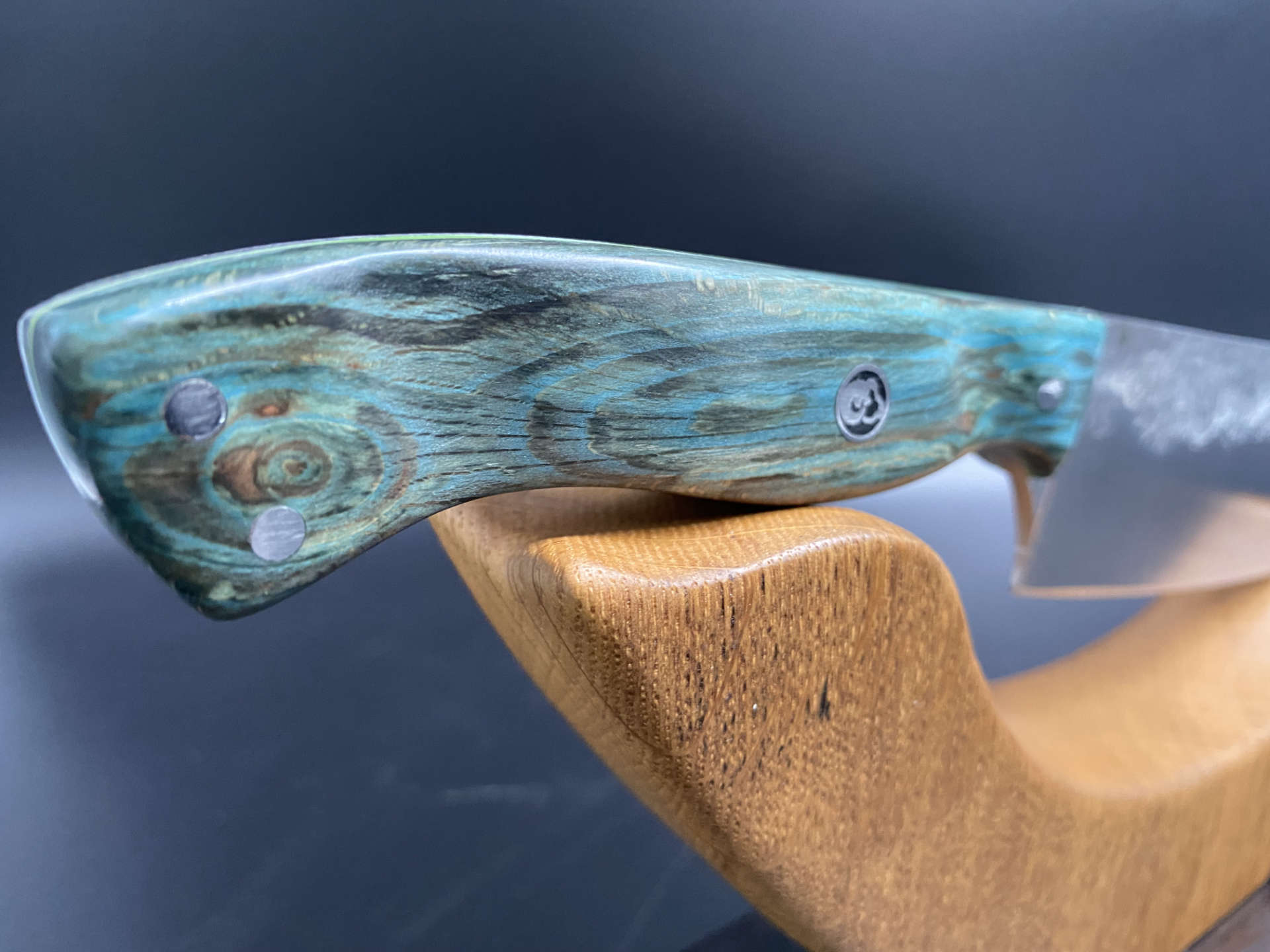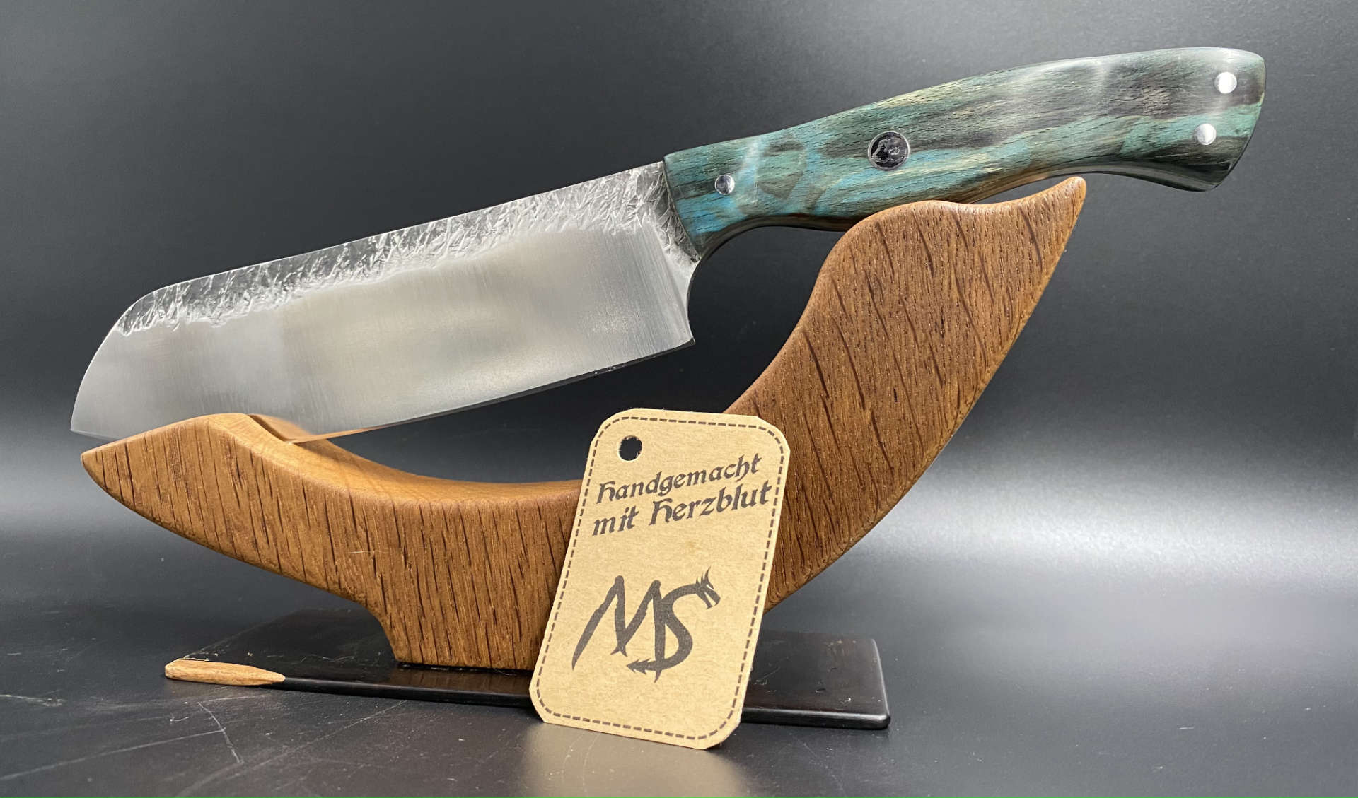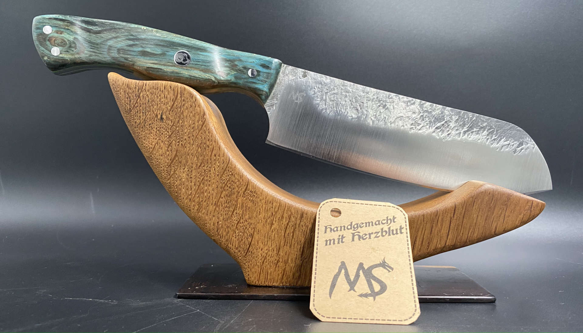 Dieses kleine Santoku ist ein ganz besonderes Messer für mich selbst. Deshalb auch absolut unverkäuflich. Es ist weit weg von Perfektion doch ich habe an Diesem Messer vieles das erste mal versucht. Das erste Stück Holz das ich selbst stabilisiert habe. Die „seltsame“ Griffform, die meiner Hand angepasst ist und perfekt sitzt. Das erste mal ohne Entwurf einfach drauf los gelegt und nicht zuletzt das tolle Schmiedemuster.