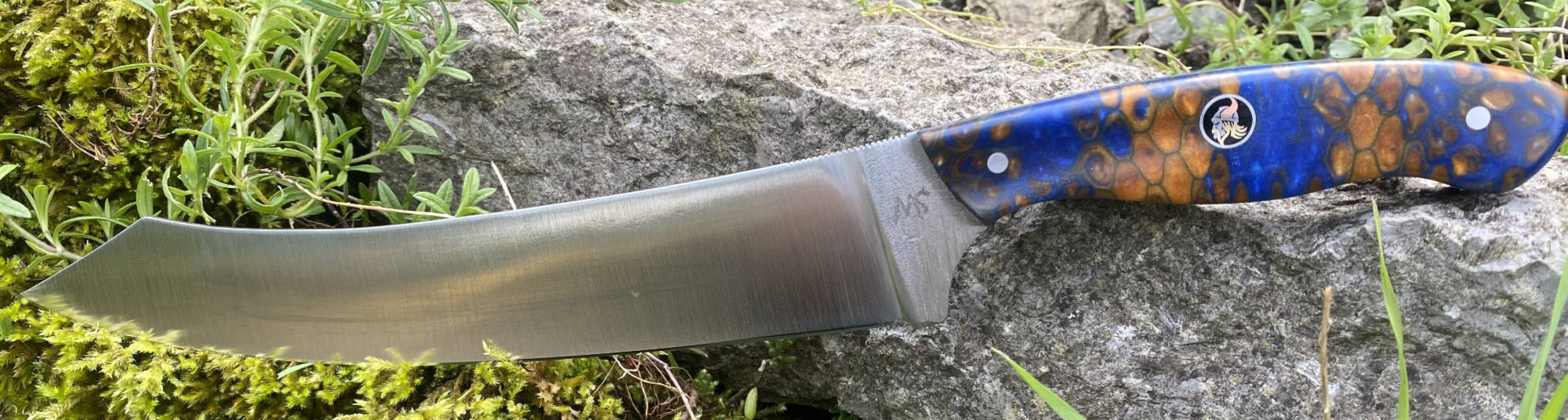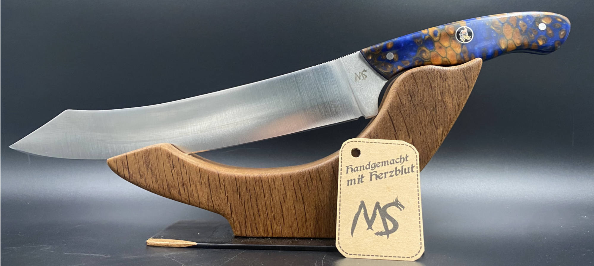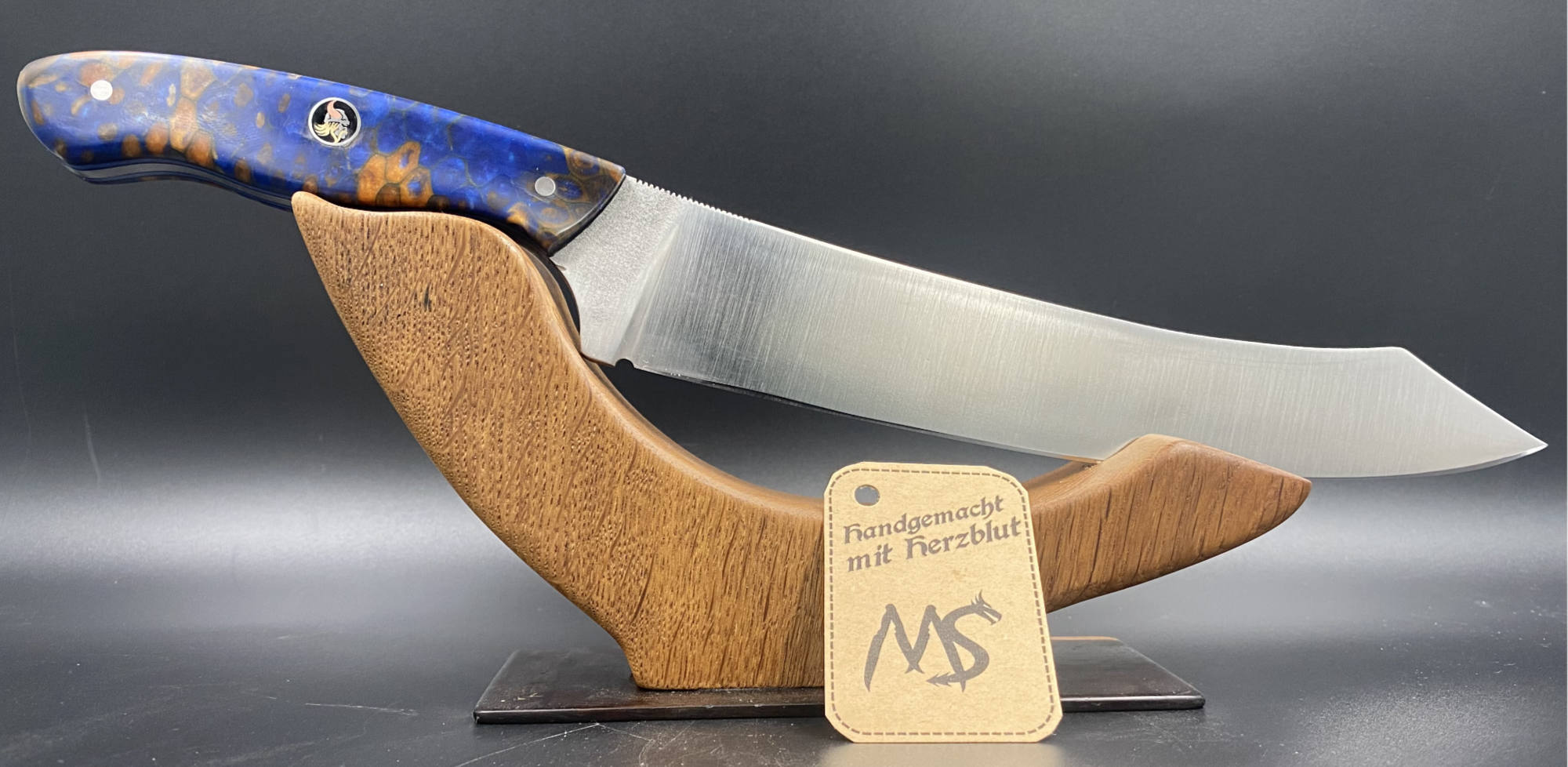 Der Fleischsäbel ist 34cm lang 22cm davon sind rasiermesserscharf! Gefertigt wurde die Klinge aus Sb1+ auf 59hrc gehärtet. Der Griff ist womöglich aus der Haut eines selbst erlegten Drachen.