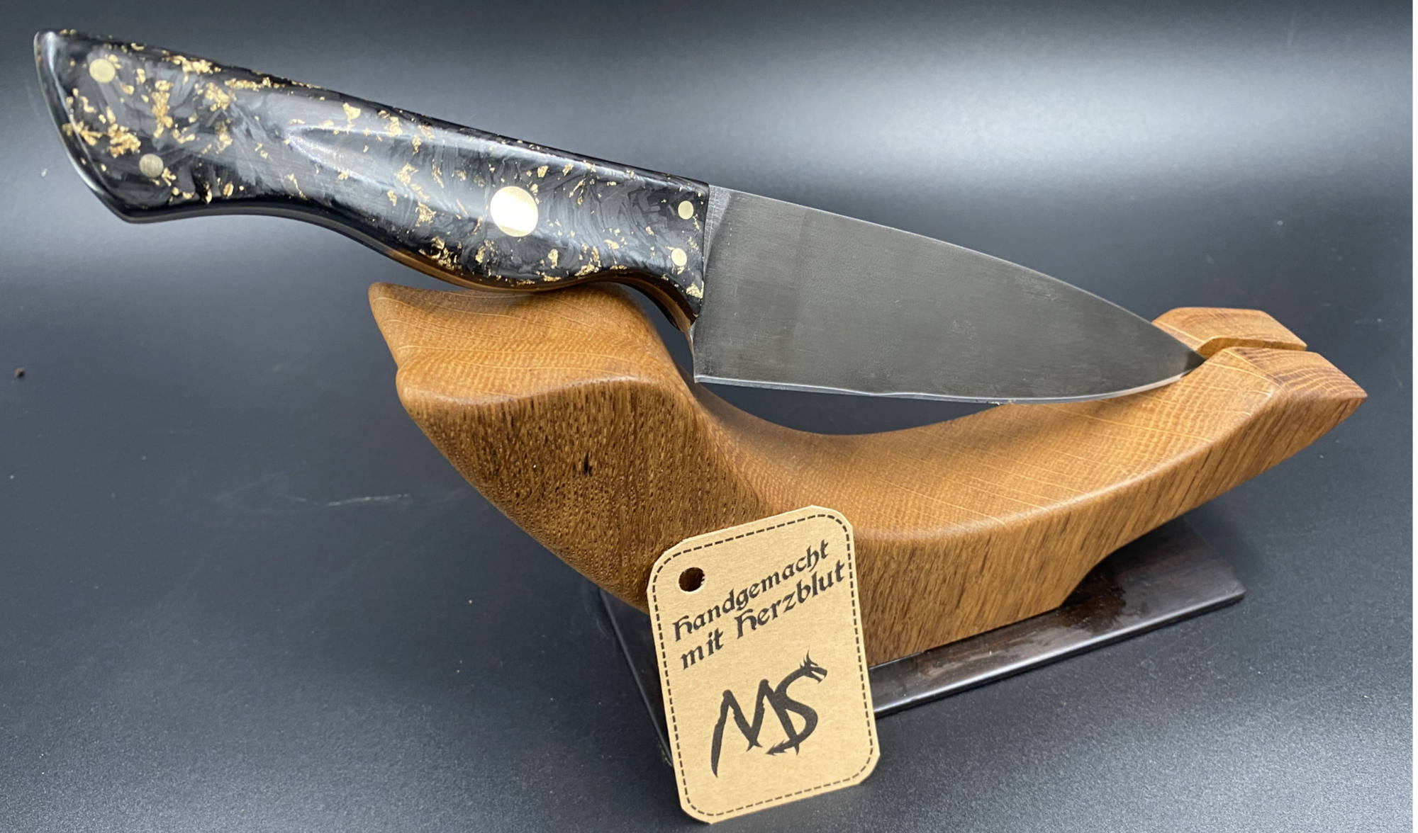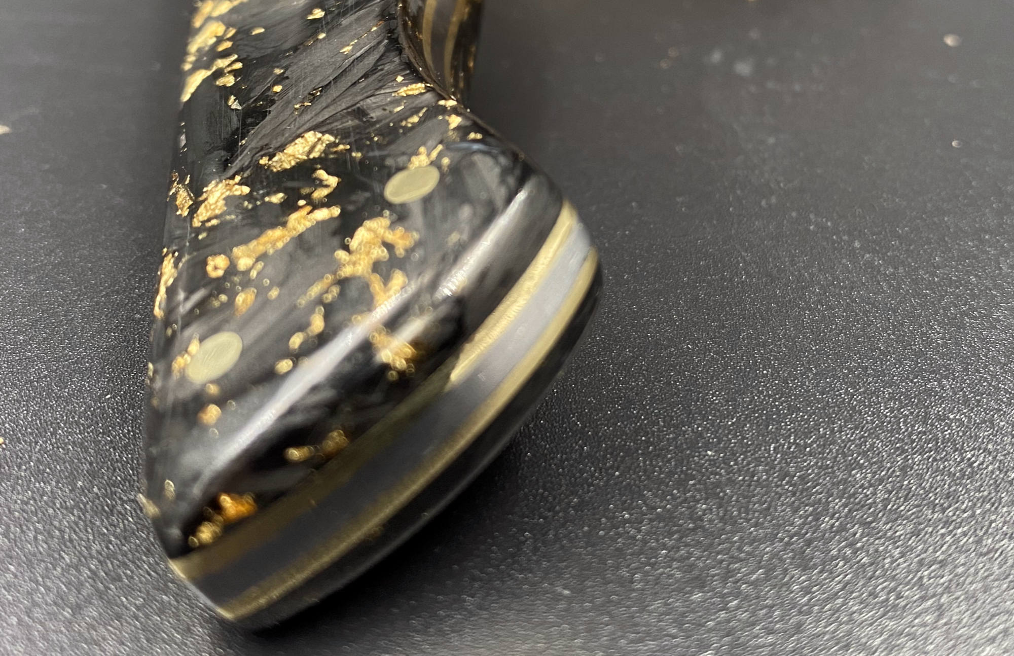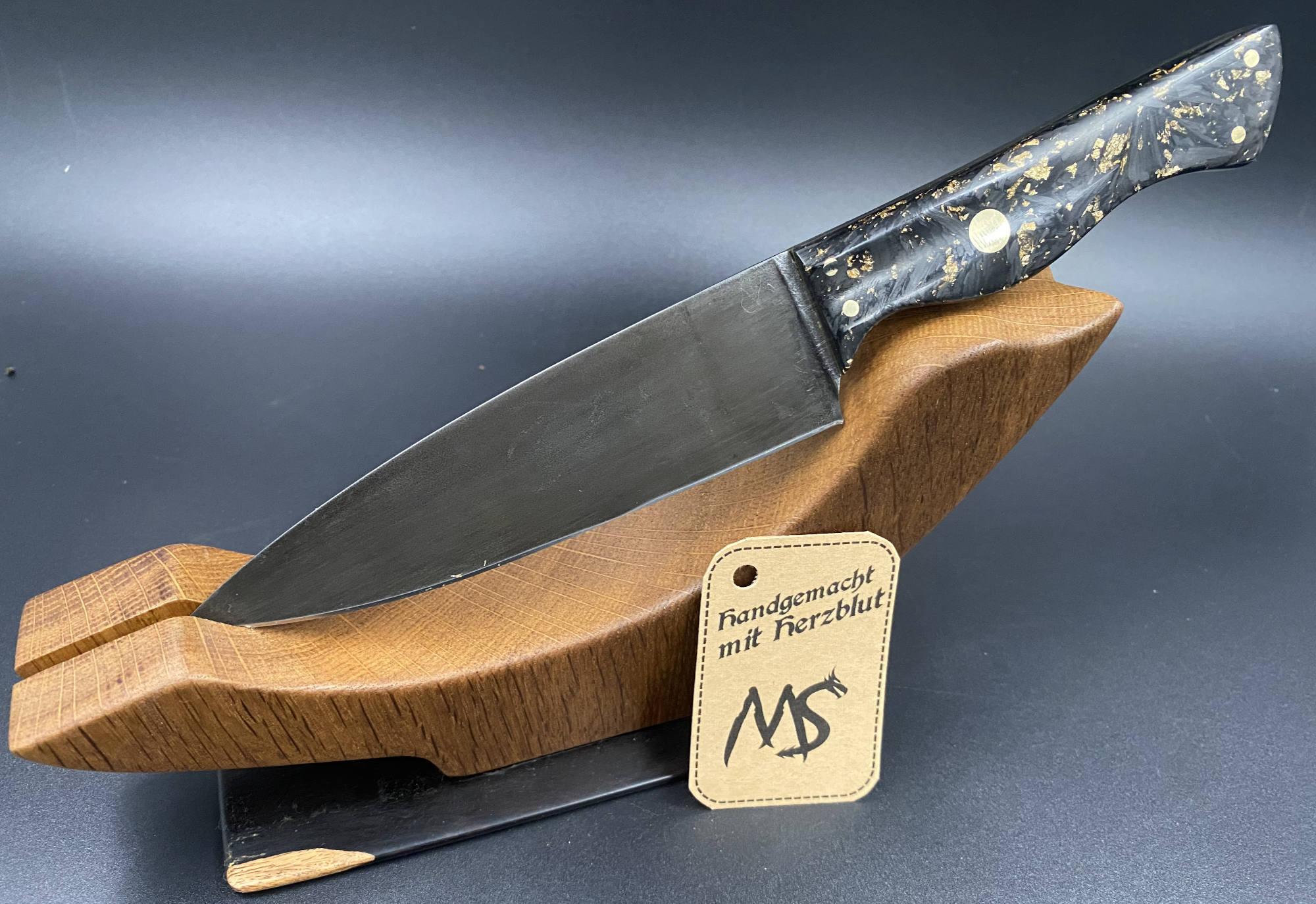 Steakmesser aus Kohlenstoffstahl Böhler 1.2842 gehärtet auf 62hrc. Griffmaterial aus Crashed Carbon mit Messingflocken und zwischenlagen aus Messing.