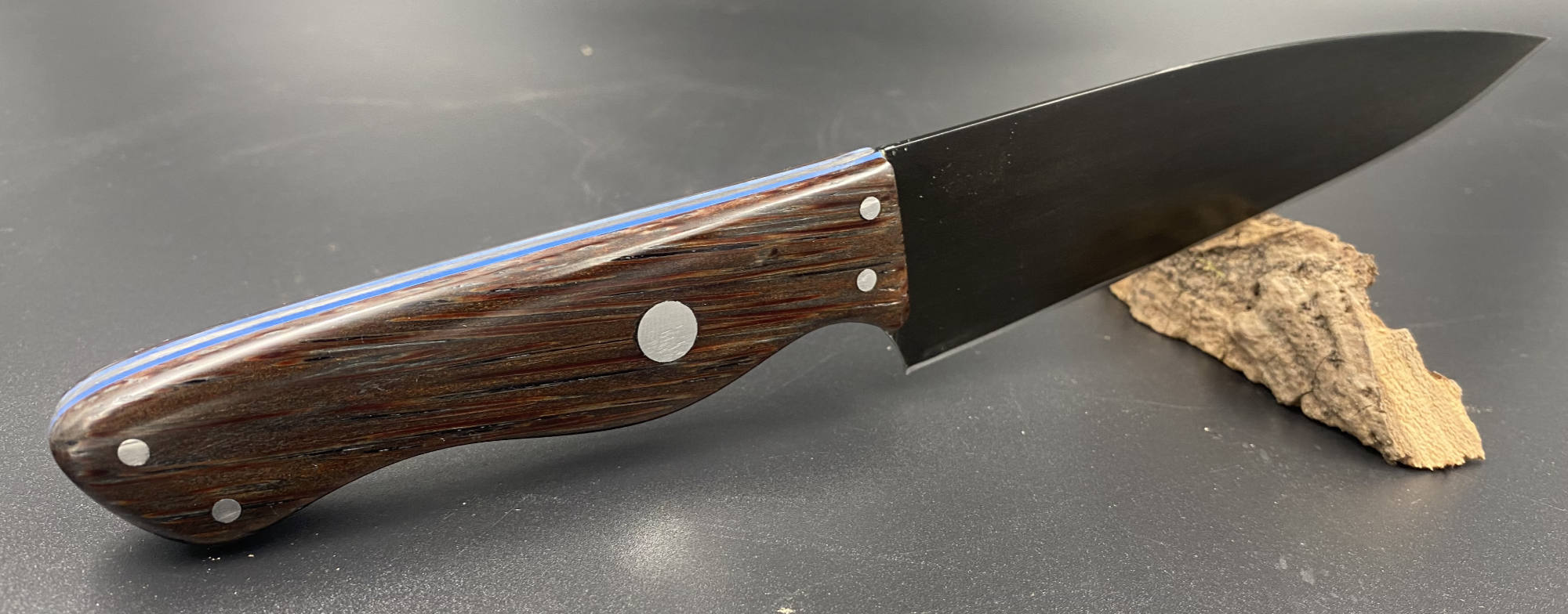 Steakmesser aus Kohlenstoffstahl 1.2842 mit Palmholzgriff auf blauen G10 Lines. Gesamtlänge 23cm davon 12cm rasiermesserscharf!