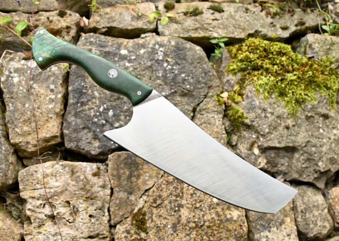 Der grüne Nakirianer ist der Prototyp eines Großen, aber dennoch dünn ausgeschliffenem Küchenmesser. Es ist aus Kohlenstoffstahl gefertigt, hier mit einem sehr markantem Griff. Sehr beliebt auch für BBQ